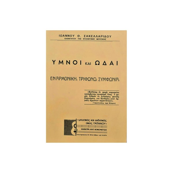 Ιωάννου Θ. Σακελλαρίδου Καθηγητού της Βυζαντινής Μουσικής, Ύμνοι και Ωδαί Εναρμονική, Τρίφωνο, Συμφωνία, εκδόσεις «Γαϊτάνου» Ηλ. Κοκονέτση