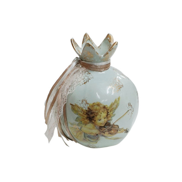 Κεραμικό ρόδι γούρι μεσαίο, σε γαλάζιο χρώμα με αγγελάκι που παίζει βιολί