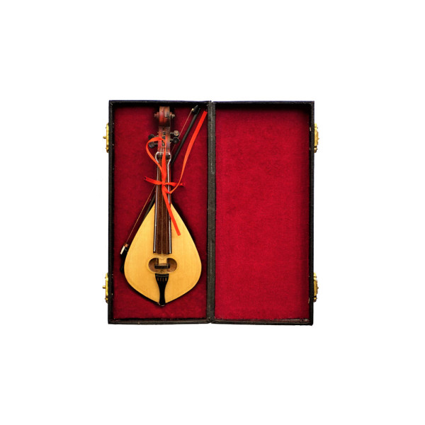 Μινιατούρα κρητική λύρα σε βαλιτσάκι, περιλαμβάνει και βάση στηρίγματος.