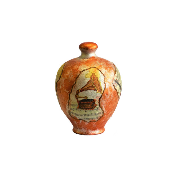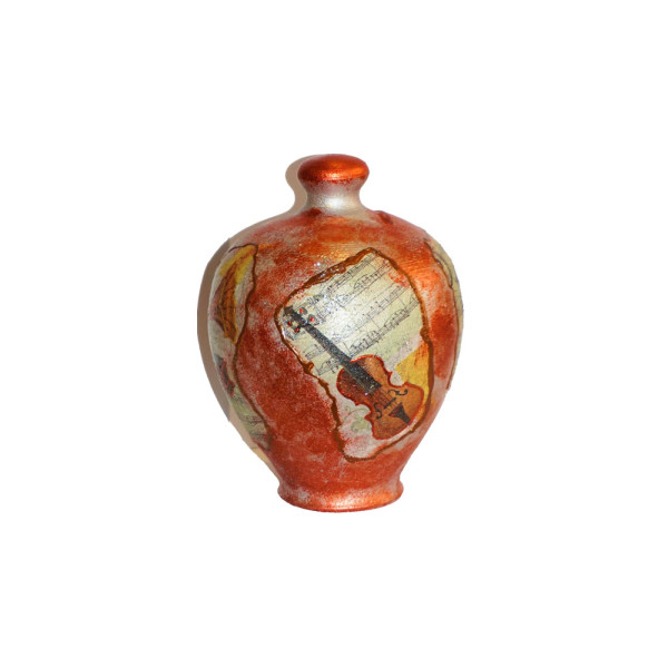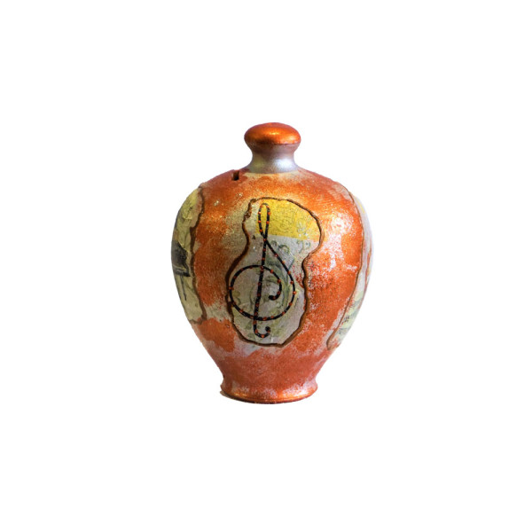 Χειροποίητος πήλινος κουμπαράς με μουσικά όργανα σε μπρονζέ χρώμα, διακοσμημένος και ζωγραφισμένος στο χέρι
